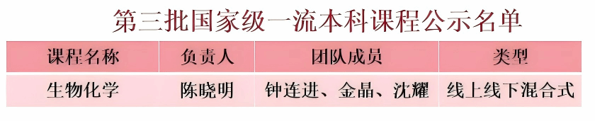 近日,教育部公示了第三批国家级一流本科课程认定结果,我院陈晓明教授主持建设的《生物化学》成功入选国家级线上线下混合式一流课程。截至目前,我院已累计有4门课分别在国家级线上线下混合式一流课程、国家级线下一流课程、国家级虚拟仿真实验项目中获得认定。